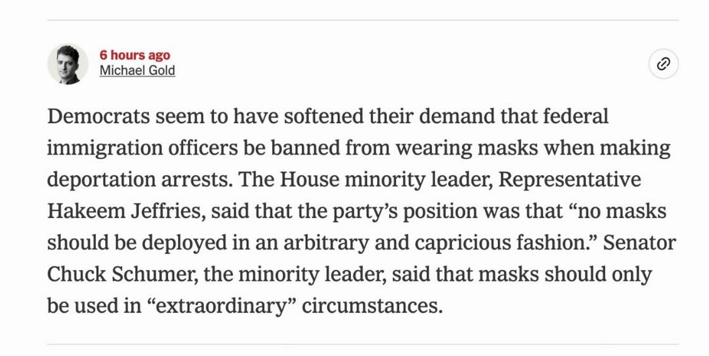 In the wake of two Americans being killed, Democratic leaders tapped their chests and the microphones to excoriate ICE’s actions in Minneapolis. But their outrage didn’t extend to do anything about it. Their negotiations with Republicans in Congress didn’t include anything enforceable, ie, body cameras and masks. Even masks, are a bridge too far, though.